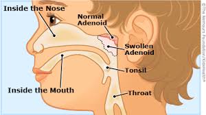 Symptoms- Children with enlarged adenoids often breathe through the mouth because the nose is blocked. Mouth breathing occurs mostly at night, but may be present during the day.